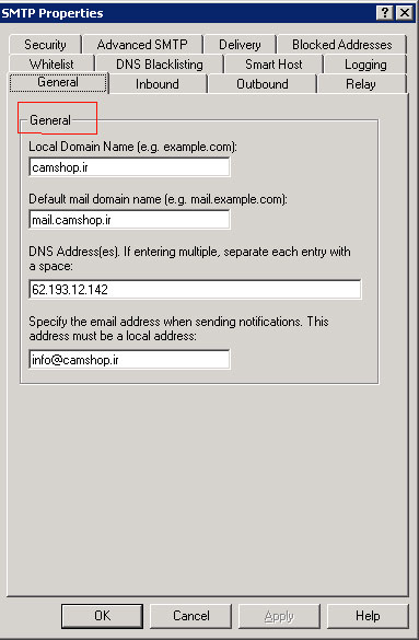 1- تغییر Local domain name پیش فرض یه یک دامنه واقعی. بهترین کار آنست که نام لوکال دامین انتخابی برای میل سرور به عنوان Reserse DNS IP آن نیز در نظر گرفته شود. مثلا اگر میل سرور شما آی پی 62.193.12.142 را دارد و نام لوکال دامین آن Server101.DNSLake.com است، شما باید با مسوول DNS ها درخواست نمایید تا این نام را به عنوان Reverse DNS آی پی در Nameserver ثبت نمایید.