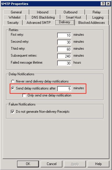 توجه: این مساله در مورد ایمیلهای برگشت خورده نیز صدق میکند. در صورتی که میلهای زیادی ی دریافت میکند که گیرنده آن در سرور وجود ندارد، بهتر است که گزینه NDR یا None delivery Receipt را غیر فعال کنید.
