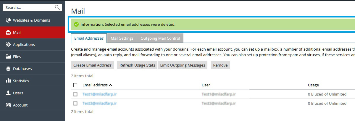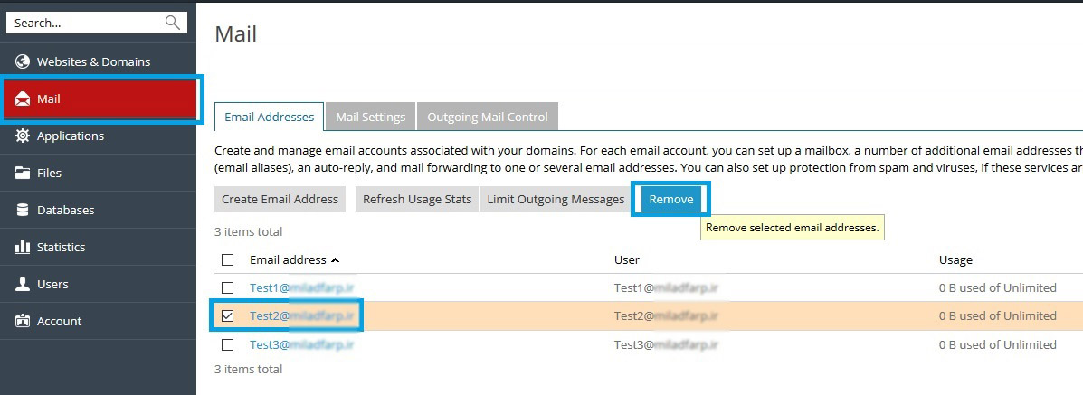 حذف میل باکس های اضافه از طریق کنترل پنل پلسک